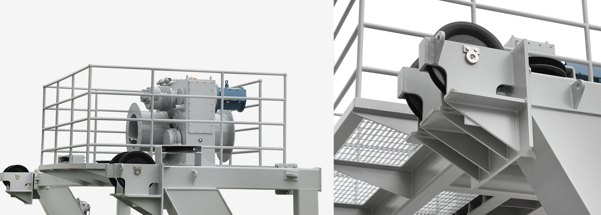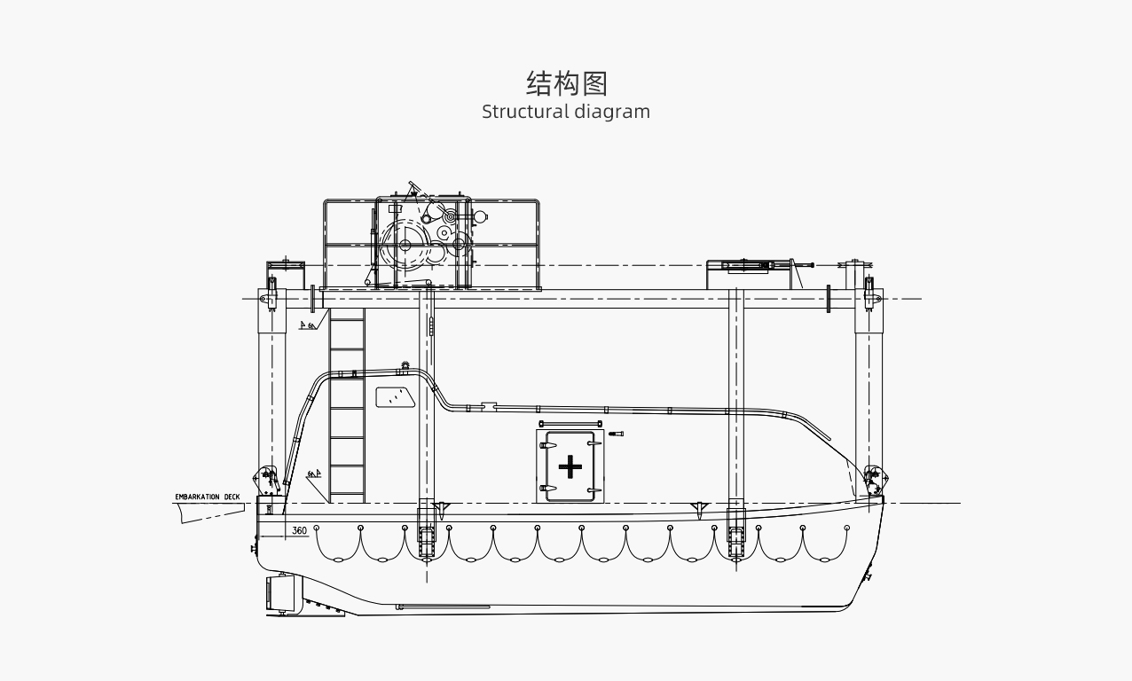 本裝置的設(shè)計(jì)、制造和試驗(yàn)完全符合1974年國(guó)際海上人命安全公約及其修正案第Ⅲ章第4、34條;經(jīng)MSC.216(82)、MSC.425(98)要求,以及MSC.48(66)《國(guó)際救生設(shè)備規(guī)則》及其修正案MSC.218(82)、MSC.427(98)和CCS《淺海固定平臺(tái)建造與檢驗(yàn)規(guī)范》及IMO《2009年海上移動(dòng)式鉆井平臺(tái)構(gòu)造和設(shè)備規(guī)則》。 本平臺(tái)吊艇架是安裝在近海鉆機(jī)上的一種專用救生裝備,同絞車配套用于近海逃生和救生,本裝置具有足夠的強(qiáng)度和剛性來(lái)可靠的通過(guò)重力下放、電動(dòng)和手動(dòng)回收救生艇。操作人員能夠觀察到整個(gè)在下放和回收的過(guò)程。緊急情況下,所有人員能夠全部登上救生艇并通過(guò)拉動(dòng)艇內(nèi)的遙控裝置使得救生艇快速的下放至水面逃生。通過(guò)遙控器,船員可以在艇內(nèi)通過(guò)與制動(dòng)臂和小滾筒上的線軸連接的導(dǎo)線釋放和停止絞車的手剎。船員也可以在甲板上操作手剎。